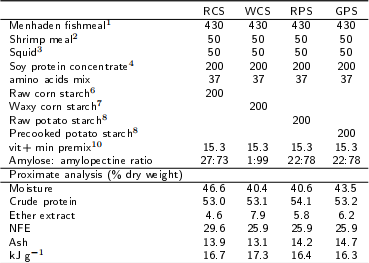 To evalúate the different starches, a com- pletely randomized design with four treatments and three replicates per treatment was set. Juveniles were set into experimental tanks and fed with four different diets for 93 days (3 tanks per diet; n=30 per treatment). The starches tested were: Native raw cornstarch (RCS), waxy cornstarch (WCS), raw potato starch (RPS) and gelatinized potato starch (GP) at a 20% of inclusión level. Crude protein 41-47%; lipid 5-8%; ash 13-15%; Nitrogen free extract 26-29%; 16-17 kJ g-1 (Table 1). The protein sources were selected according to Silva et al. (2014). Macroingredients previously sieved (< 250 ^m) and mixed with micro-ingredients during 15 min then 20-30% water added. The mixture was subsequently extruded through a meat mincer and collets dried to 10% and stored at -20 °C until fed. During the trial, fish were fed 3% body weight, by hand twice a day, 7 days a week and monitored monthly for biometry. Water temperature 27.2 ± 1.1 in the morning and 27.6 ± 0.9°C in the after- noon, salinity 37.4 ± 0.1 ups, dissolved oxygen 5.5 ± 0.3 mg L-1 were recorded.
