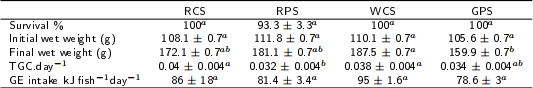 Valúes displayed survival rate (%), thermal growth coefñcient (TGC) daily calculated as: final body weight 1/3-initial body weight 1/3/T°C* number of days*100 (Cho 1992). Ingestion rate was calculated based on 3% biomass recalculated to convert into energy valúes (Table 1).