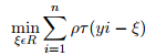 Donde: I(.) denota la función indicadora. Al minimizar la esperanza de ρτ (Y - ξ), con respecto a ξ, ξ(τ), la más pequeña de las cuales está en Q(τ). Analógicamente, la muestra de Q(τ), que proviene de una muestra aleatoria y1, ..., yn, de Y's, correspondería a la τ-ésima muestra cuantílica, de modo que el problema de optimización se puede expresar como: