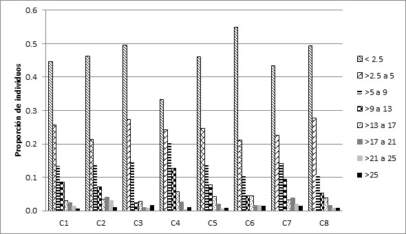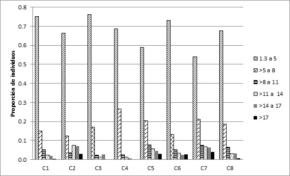 La biomasa acumulada en la vegetación aledaña a la cueva El Volcán de los Murciélagos varió entre 4.23 y 51.95 ha−1, y el carbono acumulado entre 1.99 y 24.42 Mg ha−1; siendo en ambos casos significativamente menores los valores en los sitios del borde cercano (Tabla 2). En relación con la biomasa y el carbono acumulados en las diferentes clases diamétricas, se observó que las categorías con hasta 9 cm de Dn contienen menos del 10%, salvo en el caso de los sitios de borde cercano (5 y 7) con más del 15%. Por otro lado, las categorías con más de 17 cm almacenan más del 40% de la biomasa y el carbono total.