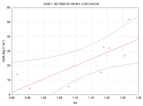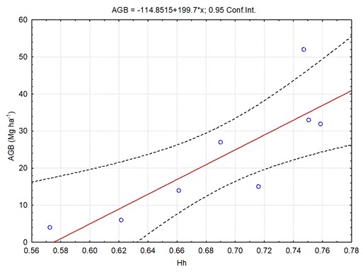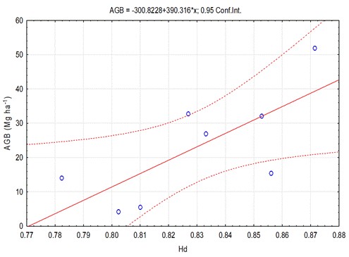 La correlación entre la diversidad estructural (Hs, Hd y Hh) y la acumulación de biomasa (AGB) en la vegetación leñosa aledaña a la cueva es significativa y positiva, es decir, a mayor diversidad estructural mayor cantidad de biomasa acumulada (Figuras 3, 4 y 5). La correlación más fuerte se presenta con el índice de Shannon-Wiener por clases de altura (Figura 4), seguida por la diversidad estructural medida como el índice de Shannon-Wiener por especies (Figura 3).