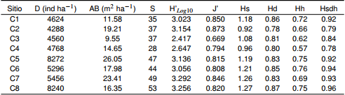 Los valores de diversidad estructural estimados mediante el índice de Shannon-Wiener para las especies (Hs), variaron entre 0.91 y 1.27, en general los sitios del borde cercano presentaron valores significativamente menores que los del borde lejano (Tabla 1). El mismo patrón se presentó con los valores del índice de diversidad estructural por clases diamétricas (Hh) que osciló entre 0.57 y 0.76; sin diferencias significativas entre los valores del índice de Shannon-Wiener por categorías de altura Hd (Tabla 1). El índice promedio de la diversidad estructural (Hsdh) tuvo valores entre 0.78 y 0.96.