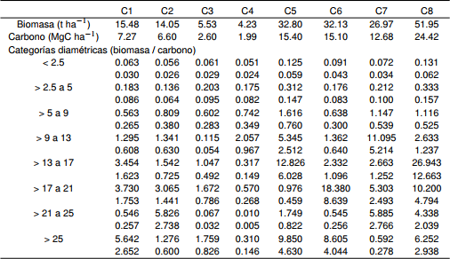 La estimación de biomasa por sitio de muestreo se calculó con la sumatoria de la biomasa de cada uno de los individuos presentes. La cantidad de carbono contenido en el componente aéreo de cada individuo se calculó con la conversión de biomasa a carbono con el factor 0.47 (Fonseca et al. 2011).