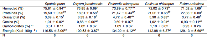 La choka y tikicho tuvieron carnes con humedad cercana a 72%, mientras que la keñola, pato puna y pana superaron el 75%. Es posible que estas diferencias se deban a que las tres últimas especies viven y se alimentan en zonas casi exclusivamente de aguas interiores, en cambio la choka y el tikicho frecuentan zonas de orilla, lo que podría influir en las diferencias de humedad. Al respecto, se conoce que aves domésticas como el pollo y pavo que son terrestres tienen contenidos de agua menores al 72% (Astiasarán y Martínez 2003, USDA 2017); mientras que en las aves acuáticas el ambiente en que viven y el tipo de alimento que consumen como plantas e invertebrados acuáticos con alto contenido de agua (80%) pueden influir en su mayor contenido de humedad (Fredrickson y Reid 1988).