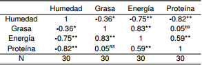 Una correlación negativa significativa indica efecto antagónico entre el contenido de agua y de proteína, disminuyendo la proteína con el incremento de la humedad (r = -0.82). Además, la correlación positiva entre el contenido de grasa y energía (r = 0.83) indica que a mayores contenidos de grasa se incrementa la energía. Mientras que la humedad y energía tuvieron asociación negativa (r = -0.75) (Tabla 2).