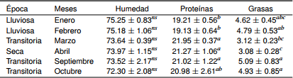 Se encontró efecto significativo con la época sobre las concentraciones de proteínas (F(5,20) =3.24, p = 0.026) y grasas (F(5,20) = 5.77, p = 0.002) en las carnes (Tabla 3). Se tuvo mayor concentración de proteínas en los meses secos (marzo, abril y septiembre) y mayores niveles de grasas en meses lluviosos (enero, febrero). No se observó diferencias significativas entre meses para la humedad (F(5,20) = 1.01, p = 0.44), cenizas (F(5,20) = 0.35, p = 0.877), carbohidratos (F(5,20) = 1.04, p = 0.411) y energía (F(5,20) =2.14, p = 0.10).