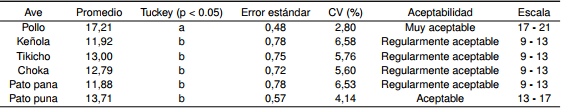 La prueba sensorial indica que las carnes crudas de estas aves silvestres tienen poca aceptabilidad sensorial en personas no habituadas a su consumo. La carne de mejor agrado y menor rechazo al color fue la de choka, con percepciones acumuladas desde ligeramente agradable hasta muy agradable en un 70.80% y opiniones como ni agradable ni desagradable hasta muy desagradable sumaron 29.20%, similar apreciación tuvieron para la consistencia, aunque para el olor la tendencia a desagradar superó el 60%. Sólo el tikicho y pato puna superaron en 50% la tendencia a agradar tanto en color, textura y olor; para la keñola la tendencia a desagrado llegó al 60% en los tres parámetros y el pato pana tuvo desagrado principalmente en textura (58.4%) y olor (50%). Para el pollo el color y consistencia recibió opiniones acumuladas del 91.6% en tendencia a agradar y para el olor hasta 79.2%. Para el índice de aceptabilidad sólo el pollo alcanzó la condición de muy aceptable con valor promedio de 17.21, las carnes de tikicho, choka y keñola se categorizaron como regularmente aceptables con valores de 13.00, 12.79 y 11.92, respectivamente. En tanto que la carne de pato puna con 13.71 fue aceptable. El análisis de varianza demostró que los niveles de aceptabilidad entre carnes fueron significativamente diferentes (F(5,138) = 7.58, p > 0.0001) y la prueba de Tuckey determinó que el índice de aceptabilidad sólo fue estadísticamente superior para la carne de pollo (Tabla 4).