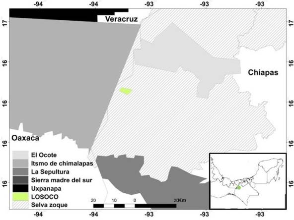 El predio LOSOCO (16o 38’ 59” LN y 93o 47’ 59” LO) ocupa 2 400 ha, se ubica a 36 km de Cintalapa, Chiapas, a 40 km al Sureste de la Reserva de la Biosfera La Sepultura y al Noreste de la Reserva El Ocote (Figura 1). El área es parte de un gran bloque de vegetación en buen estado de conservación conocido como Selva Zoque, abarca municipios de los estados de Veracruz, Oaxaca y Chiapas, además de incluir a la Sierra Atravesada en Oaxaca y la Sierra Madre de Chiapas (Lira-Torres et al. 2012). No obstante, la Selva Zoque tiene problemas de fragmentación y cambio de uso del suelo. Sin embargo, es un área que puede considerarse como corredor biológico conectado con otras selvas como la Reserva de la Biosfera el Ocote y la Sepultura en Chiapas, los Chimalapas en Oaxaca y la región del Uxpanapa en Veracruz, reconocidas por su importancia para la conservación de la biodiversidad regional (CONANP 2015). LOSOCO está certificada por Rainforest Alliance y Forest Stewardship Council por su manejo forestal sostenible. Cuenta con un jardín botánico y tres unidades de manejo para la conservación de vida silvestre (UMAs) de venado cola blanca, cycadas y orquídeas. El clima es cálido-húmedo con temperatura anual de 18 a 22 °C, mayo es el mes más cálido con 18 °C con precipitación anual de 1 000 a 1 800 mm (Arriaga et al. 2000). La altitud oscila entre 1 000 y 1 220 msnm (INEGI 2005). La vegetación de LOSOCO es diversa, pero predomina el bosque de pino-encino y el bosque tropical subcaducifolio (Rzedowski 1978); de ellos, el bosque de pino es el que más se aprovecha.