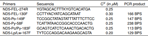 La identificación de especies por medio de excretas se realizó mediante marcadores moleculares específicos para felinos desarrolla dos por Roques et al. (2011). La extracción de ADN de heces se realizó de acuerdo con el protocolo basado en el método GuSCN/sílice (Hoss y Paabo 1993, Frantz et al. 2003). Para controlar la contaminación, durante la extracción del ADN y PCR, el procedimiento se realizó en un laboratorio diseñado para manipular material no invasivo. Para la identificación, se utilizaron los siguientes oligonucleótidos (primers): ND5-FEL-274R, ND5-FEL-130F, ND5-Po-149F, ND5-Hy-58F, ND5-Pc/Hy-183F, y ND5- Fp/Fw-167F, específicos para felinos neotropicales (Tabla 1). La identificación sexual se realizó con el método descrito por Pilgrim et al. (2005) y optimizado para su uso en muestras fecales de felinos (Puma concolor, Leopardus pardalis, Leopardus wiedii) por Roques et al. (2011) y (2014).