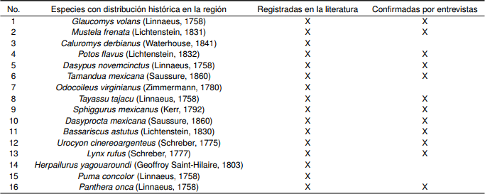 Con un total de 7 704 h trampa−1 y 144 000 m2 muestreados, se registró la diversidad gamma (riqueza regional) con un total de 11 especies con las dos técnicas de muestreo. Con la técnica del fototrampeo se registraron 10 mamíferos: Didelphis marsupialis, Didelphis virginiana, Sciurus aureogaster, Cuniculus paca, Mazama temama, Nasua narica, Procyon lotor, Conepatus leuconotus, Leopardus wiedii y Leopardus pardalis. Dos especies se registraron por transectos: Philander opossum y M. temama, la primera mediante visualización directa y la segunda por huellas. Estas especies se agrupan en cuatro órdenes, siete familias y ocho géneros. De las 16 especies de mamíferos que se registraron mediante revisión de literatura, 12 (75%) especies se corroboraron por entrevistas (Tabla 1).