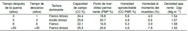 Las variables físicas (Dap, CC, PMP, humedad aprovechable) no presentaron diferencias significativas (p < 0.05) con respecto al tiempo de descanso del terreno. En todos los sitios hubo un porcentaje bajo de humedad aprovechable, debido a la poca diferencia entre la CC y el PMP (Tabla 1). Los contenidos de nitrógeno total, amonio y fósforo extraíble no presentaron diferencias significativas (p < 0.05) con relación al tiempo de descanso. El contenido de nitrato fue mayor en suelo con descanso de más de 30 años (Tabla 2).