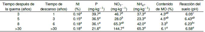 La mayor presencia de P después de la quema, se puede explicar por el aumento de la temperatura del suelo, lo que favorece la mineralización del P orgánico (Giardina et al. 2000b) y libera los fosfatos ocluidos en los agregados del suelo (Mataix-Solera et al. 2011). Los efectos de la quema en el contenido de P disponible pueden ser drásticos en los primeros años, llegando a un equilibrio en años subsecuentes de descanso, principalmente provocados por el establecimiento de la vegetación natural y el restablecimiento de los ciclos biogeoquímicos (Moya et al. 2018). Los valores de pH contrastan con el hecho de que la ceniza, producida por la quema, tiende a alcalinizar el suelo (Giardina et al. 2000a, Urretavizcaya, 2010). Este efecto es inmediato al evento fuego y los suelos del sitio son de origen volcánico, más tendientes a la acidez (Gómez-Vasconcelos et al. 2015). No se encontró una correspondencia entre el tiempo de descanso y el contenido de MO, ya que este último fue mayor en la parcela con más tiempo de descanso, con diferencia significativa (p < 0.05) solo con respecto al sitio con seis años de descanso. Al respecto, Medeiros et al. (2017) reportan un incremento significativo de carbono orgánico del suelo en los sitios con mayor tiempo de regeneración natural en un área tropical seca. Mientras que Kotto-Same et al. (1997) encontraron una fuerte correlación lineal positiva entre el tiempo de descanso y el carbono total del sistema en un área tropical húmeda.