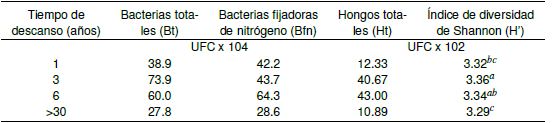 La materia orgánica y el pH tuvieron una tendencia creciente en función del tiempo de descanso. Los índices de Shannon (H') presentaron diferencias significativas (p < 0.05) entre las condiciones más contrastantes, es decir, entre la parcela con un año de descanso y la parcela con más de 30 años de descanso (B y A, respectivamente); estos valores fueron, en general, elevados. El pH es un factor importante, ya que al ser un valor exponencial, indica grandes cambios en las características reactivas del suelo. El pH tuvo diferencias significativas para los sitios con más de 30 años de descanso (A) y con un año de descanso (B); fue más próximo a la neutralidad en la parcela más descansada (A) y ligeramente ácido en el sitio más recientemente cultivado (B).