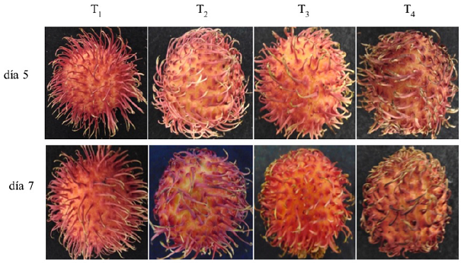 En el séptimo día los frutos de mejor apariencia, menor oscurecimiento del pericarpio y espiternos más firmes, fueron los del T1 ; mientras que los frutos que presentaron una apariencia comercial no aceptable según el CODEX (2005), fueron los del T2, T3 y T4 (Figura 1). La vida de anaquel del fruto de rambután está limitada por la susceptibilidad del pericarpio a la desecación y oscurecimiento (Patil et al. 2016). Al respecto, Landrigan et al. (1996) mencionan que cuando el fruto muestra pérdidas de peso mayores al 20%, la oxidación se hace evidente en los espiternos de donde se extiende hacia el pericarpio; ya en etapas avanzadas de deshidratación la apariencia cambia de forma negativa. Al respecto, Hassan et al. (2010) indican que al asperjar compuestos orgánicos y micronutrimentos quelatados se expresa un efecto favorable en el amarre, el peso de fruto y por tanto en el rendimiento; debido a que los metabolitos o compuestos bacterianos presentes en los biofertilizantes, hacen más eficiente la absorción nutrimental (Radzki et al. 2013).