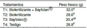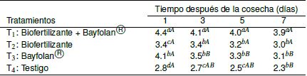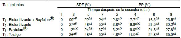 La apariencia del fruto, es una de las variables de calidad más importantes en rambután después de su cosecha; según Srilaong et al. (2002), el oscurecimiento del pericarpio del fruto depende, de la cantidad de agua que pierde por sus protuberancias epidérmicas o espiternos. Se tiene un mayor daño por oscurecimiento de los espiternos conforme aumentan los días a la cosecha, tanto en el testigo (T4) como en los frutos producidos en los árboles donde solo se aplicó el Biofertilizante (T2), el daño fue del 50%, no así para los tratamientos donde solo se aplicó Bayfolan® (T3) o en combinación con el Biofertilizante (T1); con diferencias estadísticas significativas (α ≤ 0.05) a partir del tercer día, después de la cosecha de fruto (Tabla 2).
