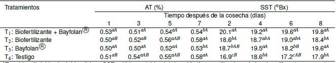 Desde el primer día se observaron cambios en la concentración de oBx, con diferencia estadística entre tratamientos (α ≤ 0.05), y valores iniciales de 16.9 a 20.1, que se modificaron en la medida que transcurrió el tiempo. Hasta los ocho días después de la cosecha, la mayor concentración acumulada fue de 19.8, siendo T1 (Biofertilizante + Bayfolan®) y T3 (Bayfolan®) los que mejor respuesta ofrecieron, incrementando los oBx hasta en un 9.5% con respecto de los frutos provenientes de árboles no fertilizados (Tabla 3). Al respecto, Vargas-Calvo (2003) reportan valores de 18.3 a 18.6 oBx en frutos de cinco cultivares de rambután. Por otro lado, Hernández-Arenas et al. (2012) concluyen que los sólidos solubles totales disminuyen de 19.3 hasta 18 oBx a los 14 días de almacenamiento, sobre lo mismo Nampan et al. (2006) recomiendan que los frutos sean tratados con hidroenfriamiento para hacer más lento el metabolismo y prolongar la vida postcosecha.