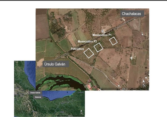 El trabajo se realizó en el área productiva de limón persa del Instituto Tecnológico de Úrsulo Galván, ubicado en las coordenadas 19○ 24’ 43.13" LN y 96○ 21’ 32.45" LO, en el Municipio de Úrsulo Galván, Veracruz, México, en la región centro costera del estado de Veracruz (Figura 1). Dentro de esta área se ubicaron tres parcelas de estudio de 0.5 ha, las cuales fueron: Parcela 1 = limón persa (Citrus latifolia) con cinco años de monocultivo, ubicada a una distancia de 250 m del policultivo con elevación de 25 m, Parcela 2 = limón persa (C. latifolia) con cinco años de monocultivo, ubicada a 100 m del policultivo con elevación de 15 m y Parcela 3 = limón persa con tres años como policultivo, con cacao (Theobroma cacao), plátano (Musa sp.) y limón, así como algunos árboles de toronja (Citrus paradisi) y con elevación de 12 m (Figura 1).