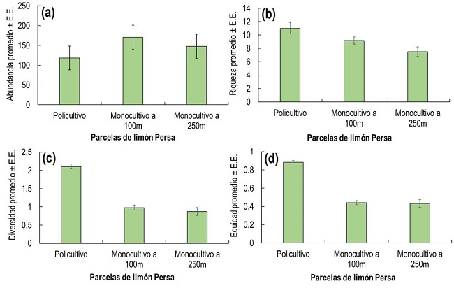 Los insectos se colectaron en tres especies de arvenses, Cynodon nlemfuensis con 75% de abundancia, Bidens pilosa con 15% y Digitaria insularis con 10%, llamadas comúnmente Zacate estrella, Mozote y Zacate mango, respectivamente. De acuerdo al análisis de similaridad de Jaccard, el policultivo compartió mayor número de morfoespecies de insectos con el monocultivo más cercano (100 m) y menor número con el monocultivo más alejado (250m (Tabla 2). Se identificaron 57 morfoespecies de insectos asociados a las arvenses dentro de las parcelas de limón Persa, los cuales correspondieron a los órdenes Coleoptera, Hemiptera, Hymenoptera, Lepidoptera, Neuroptera, Odonata, Orthoptera y Diptera (Tabla 3). Los taxones más abundantes fueron fitófagos, principalmente en los monocultivos, a diferencia del policultivo en el cual abundaron los taxones entomófagos. Se colectaron 652 insectos, de los cuales 170 fueron en el policultivo, 205 en el monocultivo a una distancia de 100 m del policultivo y 277 en el monocultivo a una distancia de 250 m del policultivo. La mayor riqueza de morfoespecies se registró en el monocultivo más cercano al policultivo. La diversidad y equidad de insectos fue mayor en el policultivo, seguido de la parcela en monocultivo más cercana al policultivo y por último el monocultivo más alejado del policultivo (Tabla 3).