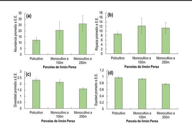 Resumen: El estado de Veracruz, México, cuenta con un potencial productivo bajo el sistema de monocultivos, pero se tienen problemas ambientales y de plagas agrícolas. Ante esta situación, se están buscando alternativas para desarrollar agroecosistemas sostenibles, como las parcelas diversificadas o cultivos intercalados. Por lo anterior, el objetivo del trabajo fue comparar la abundancia, riqueza, diversidad y equidad de fauna edáfica e insectos asociados a las arvenses en el cultivo de limón persa en monocultivo y policultivo en la región centro costera del estado de Veracruz, México. Se evaluaron parcelas en monocultivo (solo limón persa) y parcelas en policultivo (limón persa, plátano y cacao). Se ubicaron tres parcelas: 1 = monocultivo a distancia de 250 m de la parcela en policultivo, 2 = monocultivo a distancia de 100 m de la parcela en policultivo y 3 = parcela en policultivo. Se calcularon los índices ecológicos de abundancia, riqueza, diversidad, equidad y similaridad de organismos en cada una de las parcelas. Para la fauna edáfica, la parcela en policultivo tuvo la mayor diversidad y equidad y fue significativamente diferente a las parcelas en monocultivo, las parcelas en monocultivo fueron más similares entre sí que con la parcela en policultivo. Para insectos asociados a las arvenses, la parcela en policultivo tuvo mayor diversidad y equidad, además de que fue significativamente diferente a la parcela en monocultivo más alejada, pero no a la más cercana, la parcela en policultivo compartió la mayor similaridad de insectos con la parcela en monocultivo más cercana a este.
