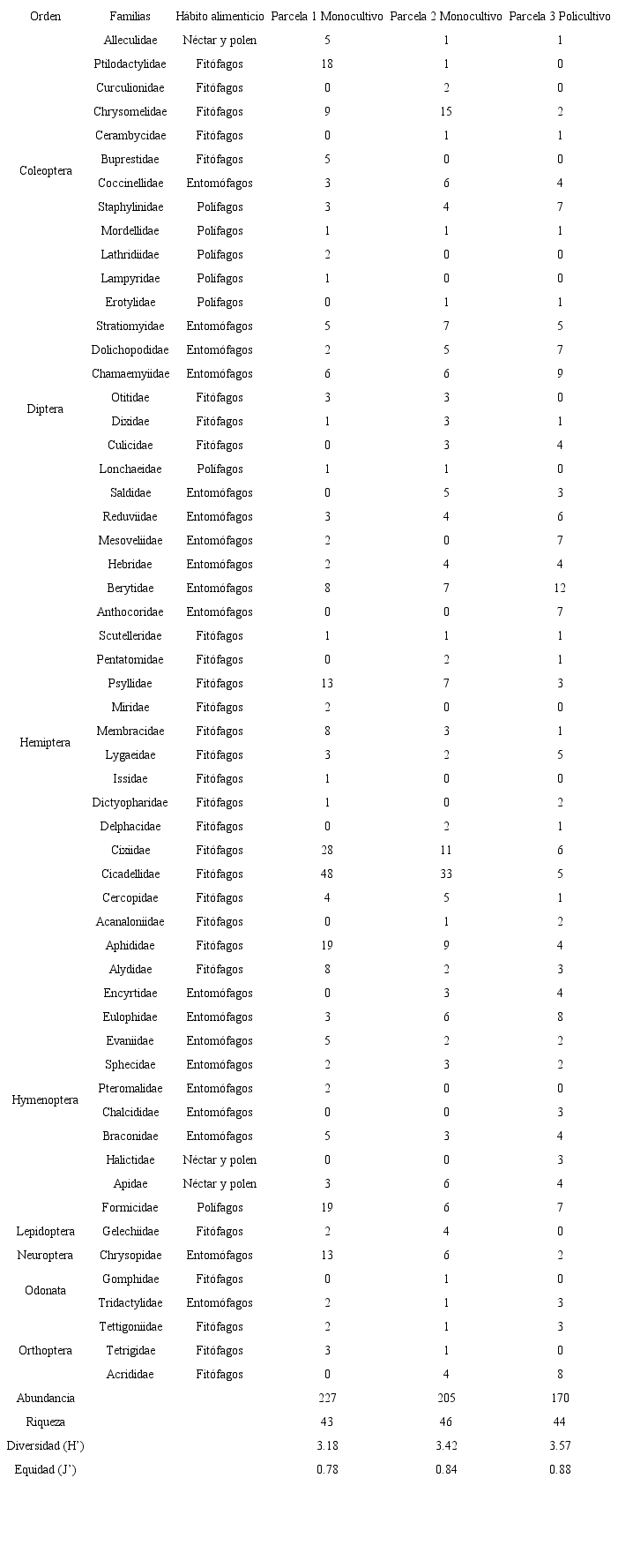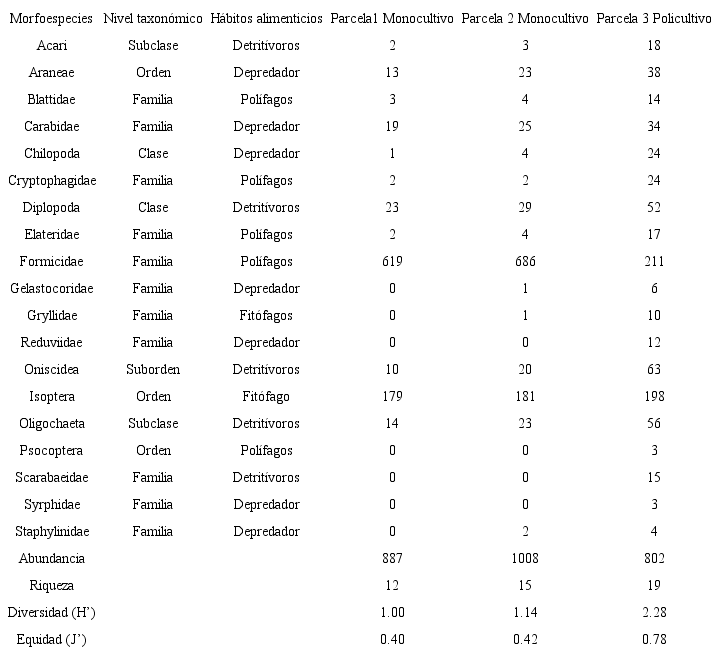 Se identificaron 19 morfoespecies de fauna edáfica, los cuales correspondieron al Phylum Arthropoda (insectos, ácaros, arañas, ciempiés, milpiés y cochinillas) y Annelida (lombriz de tierra). Los taxones más abundantes fueron Formicidae (hormigas), Isoptera (termitas), Diplopoda (milpiés), Oligochaeta (lombrices de tierra), Oniscidea (cochinillas de tierra) y Carabidae (escarabajos). Se colectaron 2 697 organismos, de los cuales 1 591 fueron polífagos, representados principalmente por hormigas, 569 fitófagos, principalmente termitas, 328 detritívoros, constituidos principalmente por milpiés, cochinillas y lombrices de tierra y 209 depredadores, principalmente arañas, escarabajos y ciempiés. La mayor abundancia se registró en los monocultivos, debido a la presencia de las hormigas, mientras que, en el policultivo los grupos de detritívoros y depredadores fueron más abundantes. La mayor riqueza, diversidad y equidad de fauna edáfica se registró en el policultivo (Tabla 1).