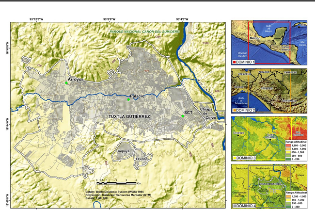 En un contexto regional, Tuxtla Gutiérrez se ubica en el extremo noroeste de la depresión Central de Chiapas (Bollo et al. 2015); colinda al norte con las montañas del Parque Nacional Cañón del Sumidero, al este con el río Grijalva y la ciudad de Chiapa de Corzo, al sur con el cerro Mactumatzá y el Valle de Suchiapa, al oeste con las estribaciones del sistema montañoso que integran la cuenca alta del río Sabinal. Las coordenadas geográficas extremas son: 16○ 40’ 30” y 16○ 48’ 00” LN y 93○ 01’ 35” y 93○ 13’ 10” LO (Figura 1). La ciudad se ubica a una altitud de 522 metros sobre el nivel del mar (msnm). El relieve se distingue por la alternancia de montañas de origen tectónico-kárstico, tectónico-acumulativo y valles tectónico-fluviales. El clima se caracteriza como cálido subhúmedo con lluvias en verano, una temperatura máxima promedio de hasta 34.5 ○C y una mínima promedio de 12 ○C, mientras que la precipitación media anual oscila entre 900 y 1 000 mm (Morales-Iglesias 2017, CEIEG 2019).