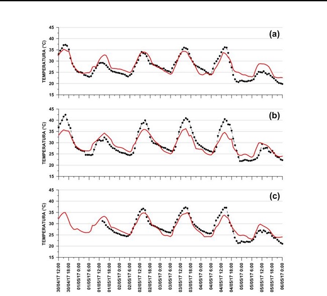 Los resultados de la Figura 2 muestran que el modelo subestimó las temperaturas en la estación Palacio. Al considerar la diferencia en la aproximación de las temperaturas en la zona centro de la ciudad, se puede deducir que la ICU tendría una intensidad mayor a 5 ○C, lo que es de interés de acuerdo a las implicaciones que esto generaría.