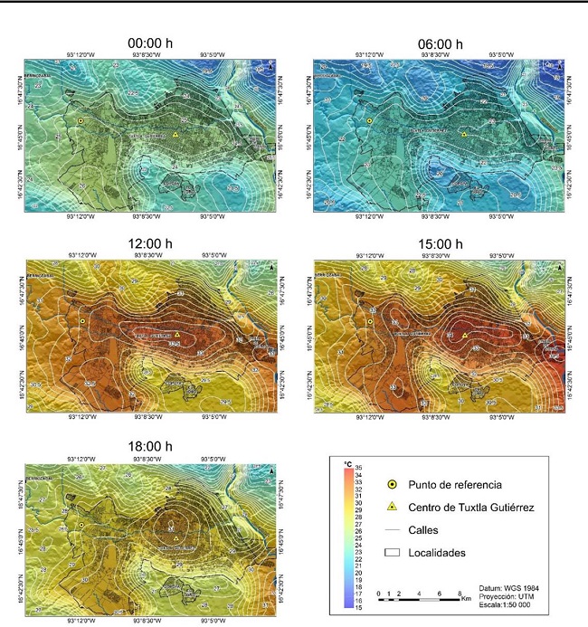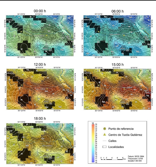 Al no existir la influencia de algún fenómeno sinóptico que pudiera alterar los resultados, se seleccionó el día 3 de mayo para determinar la presencia de ICU en la zona de estudio. En la Figura 3 se observa la evolución de las temperaturas durante el día, presentándose las temperaturas más bajas al norte y al sur del área de estudio, lo cual corresponde a las zonas con mayor margen altitudinal. La temperatura más baja (18 ○C) se presentó sobre las montañas localizadas al noreste de la ciudad a las 06:00 h, mientras que la más alta (34.5 ○C) al oriente a las 15:00 h, en las colindancias con el municipio de Chiapa de Corzo. También se observa que a las 00:00 h no se tiene la presencia de ICU definida sobre la ciudad. Con el paso del tiempo, las propiedades de los diferentes materiales de construcción comienzan a jugar un papel muy importante, ya que algunos materiales disipan el calor más rápido que otros lo que favorece la formación de la isla de calor. En este sentido, a las 06:00 h se observa la formación de la ICU con una extensión de 8.1 km2 que abarca la zona centro y oriente de la ciudad. Al tomar en consideración el punto de referencia, la ICU presenta una intensidad de 1 ○C aproximadamente.