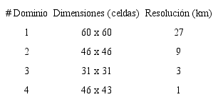 Para la configuración del MM5 se generaron cuatro dominios, el último de ellos (dominio 4) tiene una resolución espacial de 1 km y en su interior se ubica la ciudad de Tuxtla Gutiérrez (Figura 1). Debido a la resolución espacial de los dominios 3 y 4 (Tabla 1), los datos de elevación y uso de suelo fueron corregidos con la finalidad de representar de mejor manera el relieve de la región, para lo cual se empleó un modelo digital de elevación, así como la Carta de uso de suelo y vegetación de la serie V del Instituto Nacional de Estadística y Geografía (INEGI 2014). Para la inicialización del modelo, se utilizaron datos meteorológicos globales de análisis final con una resolución espacial de 1 x1 y temporalidad de 6 h (NCEP 2000). Para mejorar el análisis meteorológico realizado por el modelo durante la simulación en la región de interés, se utilizó la técnica de análisis objetivo (Grell et al. 1994, Dudhia et al. 2005), mediante la incorporación de variables observadas por las estaciones meteorológicas instaladas a lo largo de la ciudad para el dominio de mayor resolución.