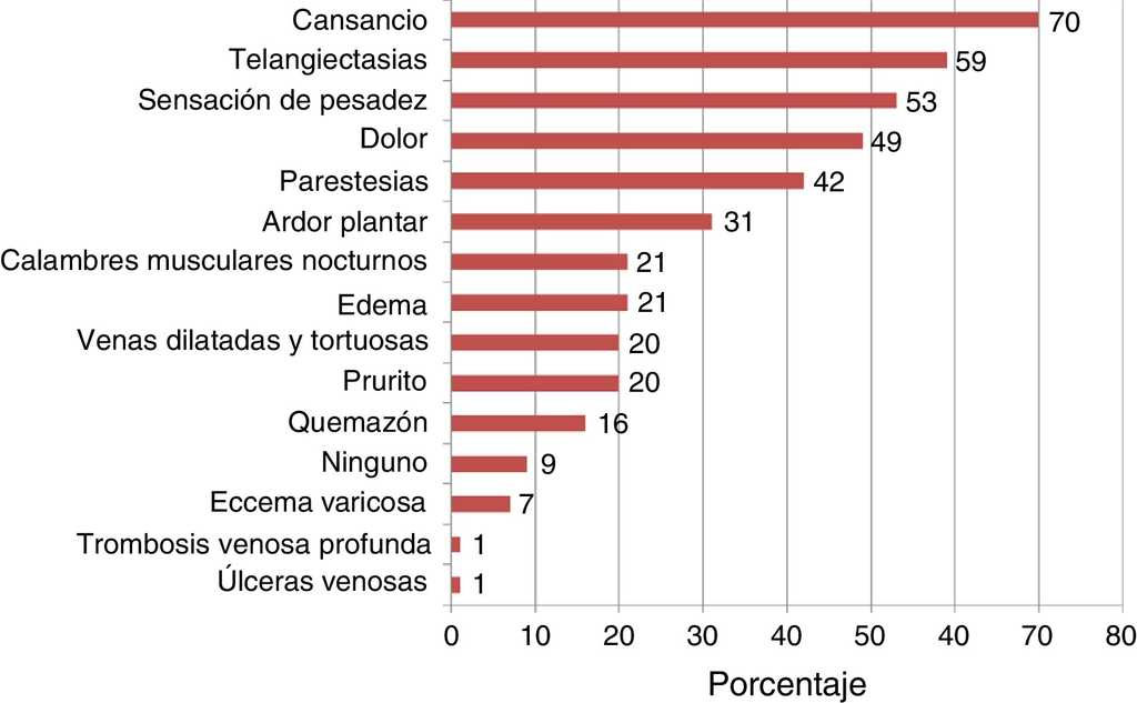 La prevalencia de la insuficiencia venosa periférica mostró que el 68% la padece, el 28% no la presenta y el 4% no lo sabe; los síntomas que presentó la población estudiada fueron, cansancio en un 70%, pesantes un 59%, dolor de piernas un 49%, parestesias un 42% y calambres un 21%, entre otros (fig. 1).