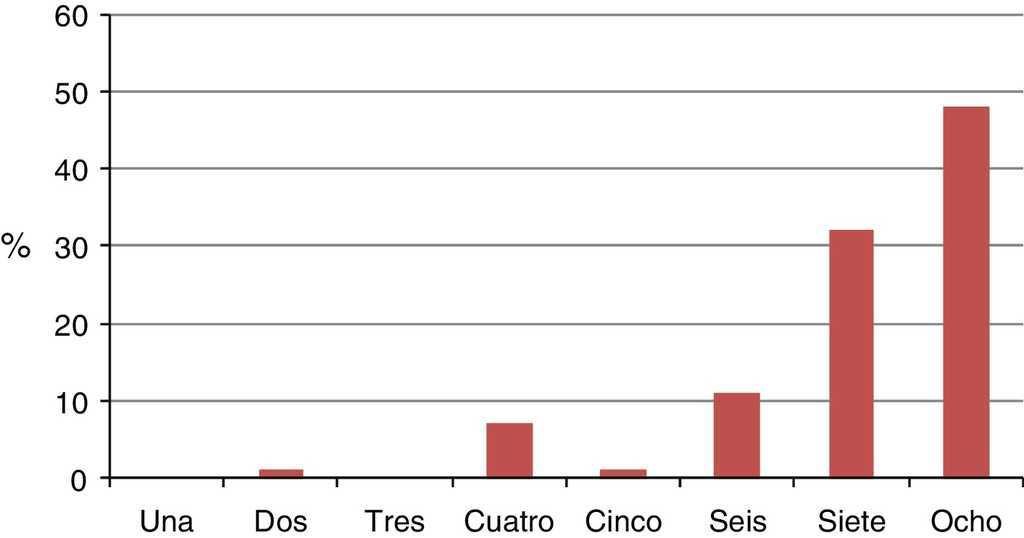 Los resultados de las características laborales fueron los siguientes: en cuanto a las horas que permanecen en bipedestación durante la jornada laboral, el 8% de las enfermeras expresaron que 2-4 h; el 12%, 5-6 h; el 32%, 7 h; y el 48%, 8 h (fig. 2).
