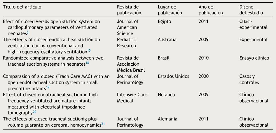 Se realizó una revisión bibliográfica durante el mes de octubre de 2014 a febrero de 2015 en las siguientes bases de datos: CUIDEN, PubMed, LILACS y COCHRANE. Los descriptores empleados fueron: endotraqueal, succión, aspiración, sistema cerrado/abierto y neonatos, en español e inglés, se combinaron con los boléanos «AND» y «OR». Como límites de búsqueda se establecieron estudios con recién nacidos publicados entre el año 2000 y 2015, en idioma español e inglés. Como resultado se obtuvo un total de 417 artículos. Tras la aplicación de los criterios de inclusión, reducidos solo a revisiones sistemáticas o metaanálisis que midieran la efectividad de las técnicas de aspirado, e investigaciones de tipo analítico y experimental que compararán el factor de exposición (técnica de aspiración cerrada y/o abierta) y el desenlace (infecciones y/o alteraciones postaspiración), solo cuatro artículos respondían a la pregunta establecida. Asimismo, se encontraron dos artículos de la lista de referencias que cumplían con el objetivo del trabajo. Finalmente, se obtuvo un consenso de seis artículos de los cuales se hizo un análisis en profundidad para rescatar los principales hallazgos.