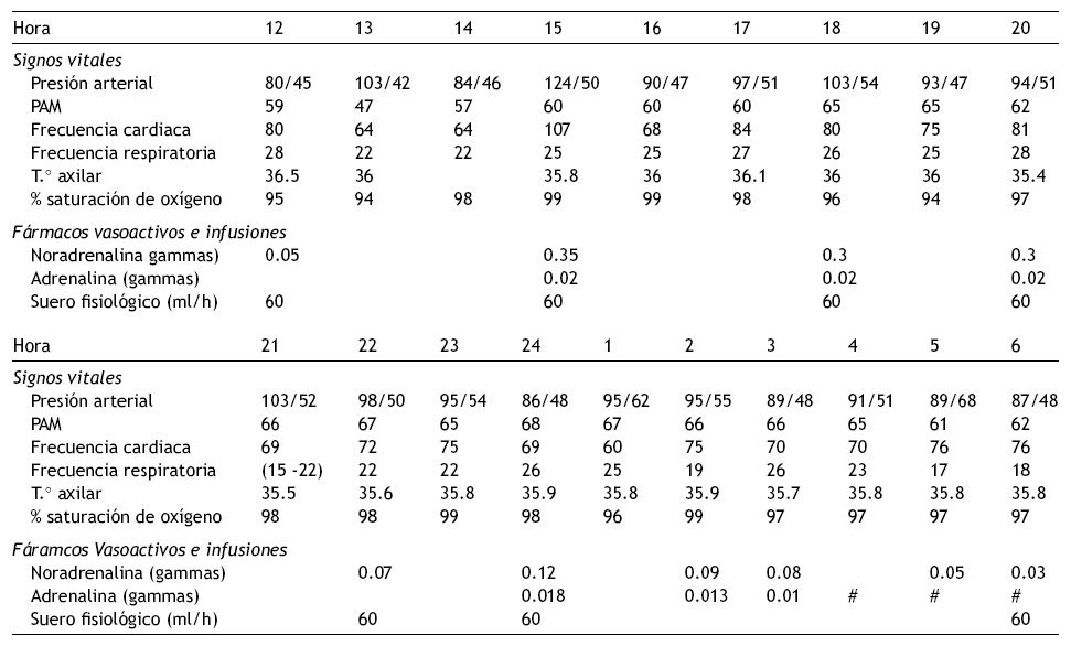 Finalizado el procedimiento el paciente estuvo tranquilo durante toda la noche, decidiéndose la retirada de la contención física; se mantuvo hemodinámicamente estable, por lo cual a las 12 h posterior a la entrega de turno se indica la suspensión de los fármacos vasoactivos. A pesar del mal pronóstico que el paciente tenía, en el turno siguiente es candidato a extubación y reevaluación activa por especialistas.