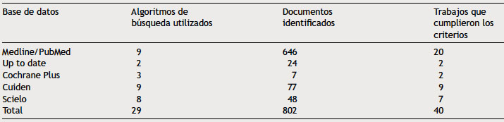 El periodo de búsqueda fue el comprendido entre los años 2000 y 2016; se establecieron como límites de idioma: inglés, español. Se han incluido 3 documentos previos al año 2000 debido a su especial relevancia en el tema.