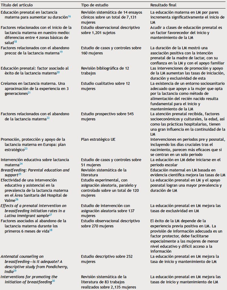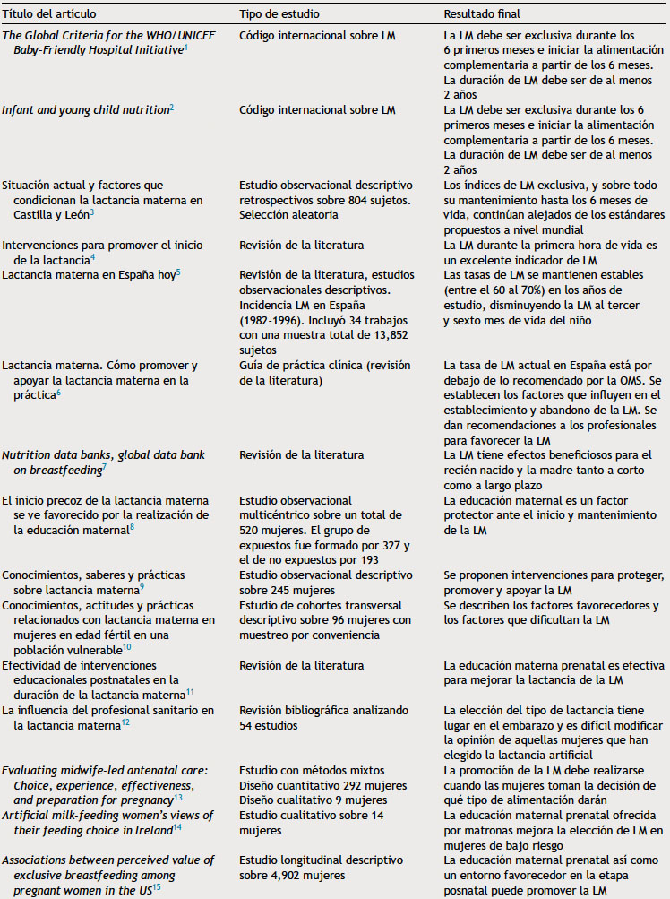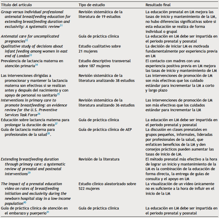 De la búsqueda bibliográfica realizada, se seleccionó un total de 40 documentos, entre los que se encuentran estudios observacionales de cohortes y transversales, estudios descriptivos transversales, revisiones bibliográficas, 2 guías de práctica clínica, una guía on-line NICE y un Plan estratégico sobre protección, promoción y apoyo a la lactancia en Europa. En la tabla 2 se expone un resumen sobre el tipo de estudio y los principales hallazgos de los trabajos analizados.