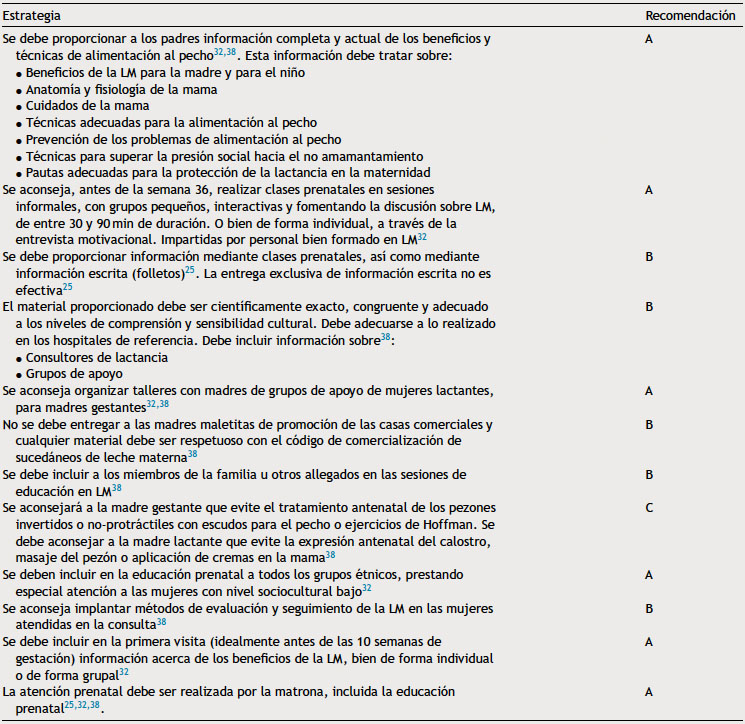 En el estudio multicéntrico realizado por Yaque et al.18 se establece que se debe informar en la educación prenatal sobre las ventajas de la LM, y al mismo tiempo deshacer mitos y ayudar a establecer expectativas realistas sobre la misma. Es importante incluir información sobre la técnica de la lactancia y prácticas para la prevención de futuros problemas, de tal forma que se favorezca la decisión informada sobre la elección de la alimentación infantil. En la guía de práctica clínica publicada por la AEP se recomienda, tras analizar estudios con una calidad metodológica II-b, tratar otros temas importantes, como la anatomía y fisiología de la mama, los cuidados de la mama (desarraigar el tratamiento prenatal de los pezones invertidos), así como dotar de herramientas para superar la presión social hacia el no amamantamiento, fuerza B de recomendación38.
