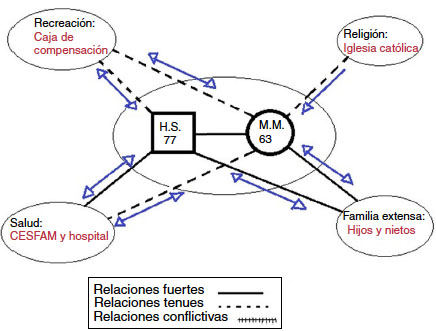 Solidaria: Realizan diversas actividades juntos (ir a la feria, ir a ver a sus nietos, etc.); duermen en la misma cama y comparten la rutina diaria. Doña M.M. apoya a don H.S. en los cuidados de sus enfermedades, mas, este lo considera dentro de las labores que ella debe realizar, e incluso no respeta el apoyo realizado, por ejemplo, al colocarle sal a la comida que ella ha cocinado hiposódica según las indicaciones médicas. Doña M.M. ha tomado el rol de cuidador de su esposo al tornarse este dependiente leve.
