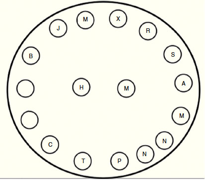 Por último, el Círculo familiar (fig. 3) constituye una representación gráfica y esquemática de la familia, la cual representa la percepción del miembro de la familia que la dibuja; esta técnica permite que la persona reconozca sus relaciones familiares, y pueda a partir de esto enfocar sus problemas de salud5,6,9.