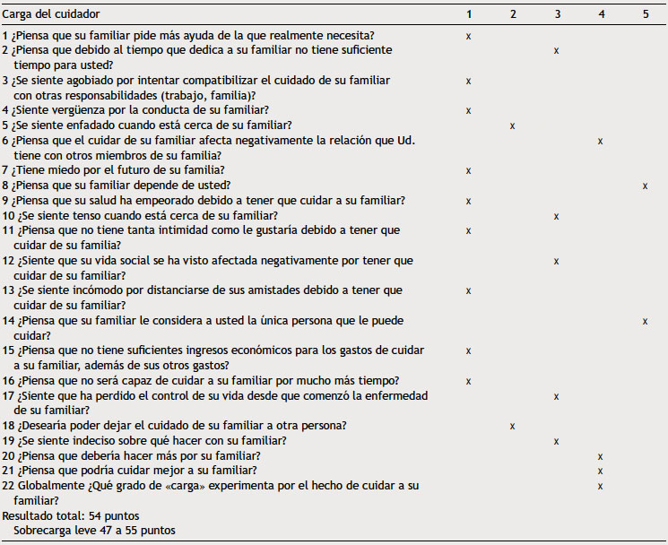 Complementariamente, frente a la situación de cuidadora de doña M.M., se aplica la Escala de Sobrecarga del Cuidador de Zarit (tabla 1), según normativa ministerial. Este cuestionario es aplicado a la persona que cumple con el rol de cuidador, mismo que representa un instrumento útil para evaluar la sobrecarga que puede asumir la persona producto del cumplimiento del rol, se califica con los puntajes 1: nunca, 2: rara vez, 3: algunas veces, 4: bastantes veces y 5: casi siempre12. El resultado obtenido en el test de Zarit de carga del cuidador indica que doña M.M. presenta sobrecarga leve en los cuidados.