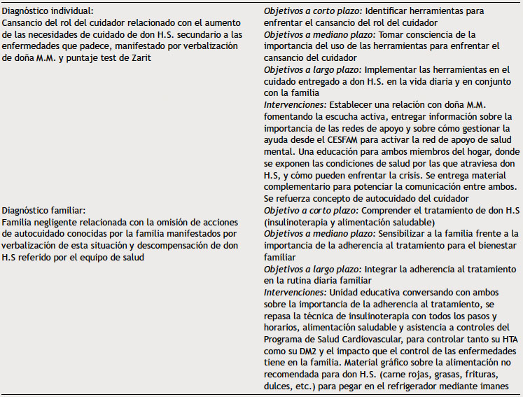 En este caso se plantean jerarquizados un diagnóstico individual y uno familiar, y se muestran en la tabla 2; frente a la valoración realizada, se descarta el motivo inicial del estudio de familia, al no existir evidencia de maltrato hacia don H.S.; por tanto se rechaza la sospecha informada por la enfermera en control.