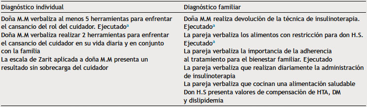 El diagnóstico individual es evidenciado en el cuestionario de cansancio del rol del cuidador, observándose rasgos característicos de cansancio como el enojo ante la cercanía de don H.S., la referencia de haber dejado de realizar actividades recreativas por sentirse cansada frente a los cuidados y la incertidumbre que refiere con relación al cuidado de don H.S. en el futuro. Cabe mencionar que se toma la etiqueta NANDA 00061 para la confección del diagnóstico14, pero con la estructura Problema/Etiología/Signos-Síntomas planteada por Marjorie Gordon, de acuerdo al planteamiento de formato diagnóstico trabajado en la Escuela de Enfermería; ya que permite la formación del pensamiento crítico por parte de los estudiantes, siempre y cuando se mantenga la congruencia de ambos sistemas.