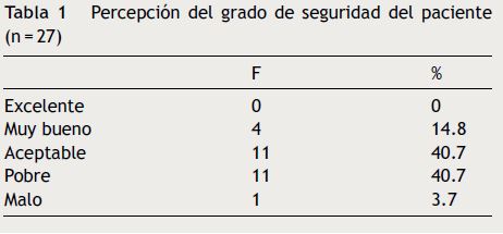 Conclusiones: Cerca de la tercera parte de los entrevistados no habían reportado ningún evento adverso en los últimos años, además de que solo un poco más de la mitad refirió percibir un clima de seguridad del paciente entre aceptable y superior.