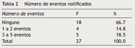 En el número de eventos notificados, el 66.7% del personal de enfermería refieren no haber notificado ningún evento, y solo 4 (14.8%) reportaron de 1 a 2 eventos en el último año (tabla 2).