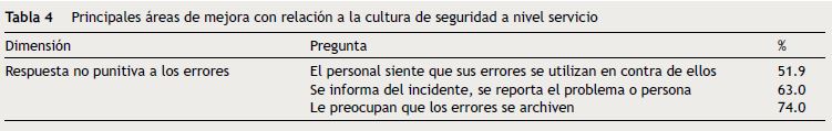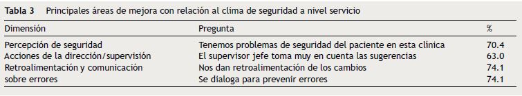 En lo referente al clima de seguridad, en el análisis por dimensión se obtuvo lo siguiente; en el estudio realizado en Estados Unidos en 2010 en 885 hospitales20, las dimensiones con la menor puntuación fueron las de respuesta no punitiva al error, y la de problemas durante los cambios de turno o traslado de pacientes entre unidades o servicios, en tanto que las 2 dimensiones con las puntuaciones máximas fueron la de trabajo en equipo dentro del servicio y la de acciones de la gerencia o la dirección para promover la seguridad. En Colombia, en el estudio que incluyó 7 centros de atención23, los autores no realizaron el análisis por dimensiones; sin embargo, el mayor número de preguntas identificadas como fortalezas se presentaron en las dimensiones trabajo en equipo dentro de la unidad y el aprendizaje organizacional/mejora continua.