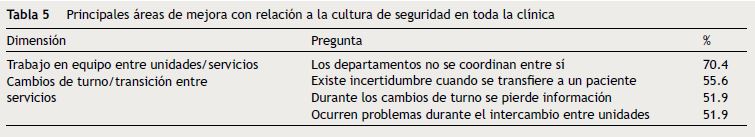 En contraste, los ítems que se presentan en las tablas 3, 4 y 5 fueron identificados como debilidades u oportunidades de mejora, los cuales involucran las 3 áreas o rubros analizados: clima de seguridad, cultura de seguridad del servicio y cultura de seguridad de toda la clínica.