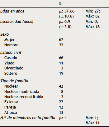 El promedio de edad de la muestra de estudio fue de 58 años, poco más de las 2 terceras partes fue del sexo femenino (67%). Respecto a su estado civil, el 66% es casado y un tercio (33%) no tenían pareja (viudo, divorciado, soltero), casi la mitad de los participantes (42%) reporta ser miembro de una familia nuclear en la actualidad. Finalmente, el promedio de años escolares cursados fue de 7 (tabla 1).