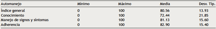 El índice general de automanejo se encuentra en una media de 81, lo que indica un buen automanejo, respecto al cual se ha señalado que se caracteriza por tener conocimiento acerca de la enfermedad, seguir el tratamiento acorde a las indicaciones del profesional, participación activa en la toma de decisiones con el personal de salud, monitorear y manejar los signos y síntomas de su condición, manejar el impacto de la condición en las áreas física, emocional y social, adoptar hábitos saludables que promuevan la salud y tener acceso, confianza y capacidad de utilizar los servicios de apoyo21.