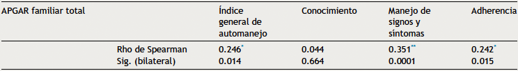 Se encontró correlación positiva significativa entre el APGAR familiar total y; 1) el índice general de automanejo, 2) adherencia y 3) manejo de signos y síntomas; todas las correlaciones fueron positivas, y se pueden interpretar de la siguiente manera: mayor índice de percepción de funcionalidad familiar, mejor automanejo o viceversa. Finalmente, no se detectó correlación entre el APGAR total y la dimensión de conocimiento (tabla 4).
