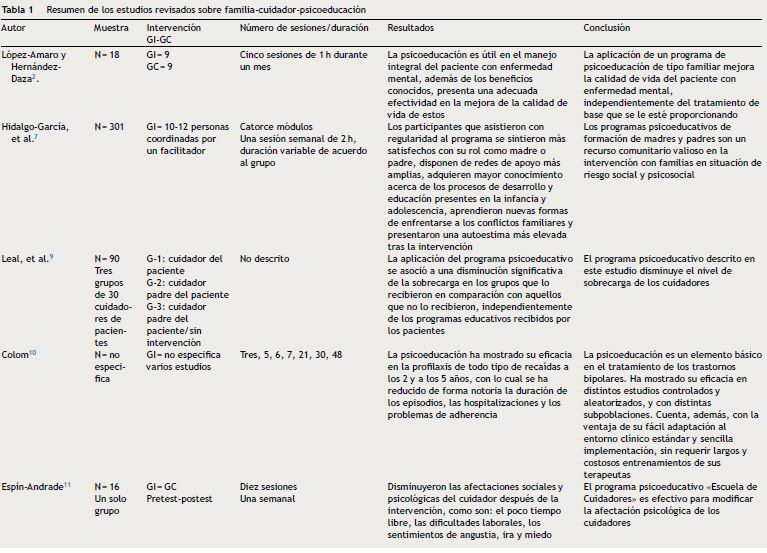Con el propósito de facilitar la lectura de los resultados y conclusiones de los estudios revisados sobre familia-cuidador-psicoeducación, se presentan las características en la tabla 1.