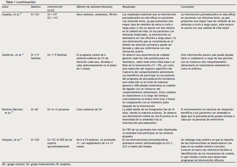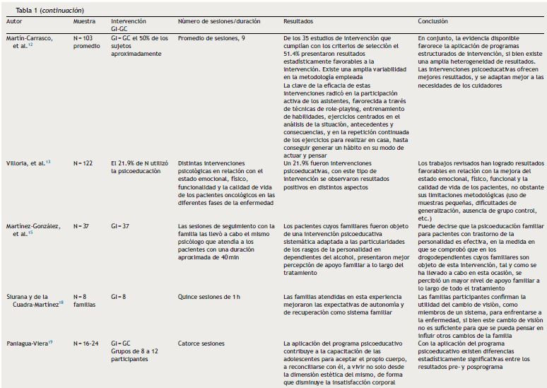 Las conclusiones de los estudios revisados refirieren que la psicoeducación es un recurso valioso en la intervención con las familias, ya que cambia la visión que tienen sobre la enfermedad o el problema, ha mostrado eficacia, y cuenta además con la ventaja de su fácil adaptación e implementación2,7,9–13,15,18–23,25–27.