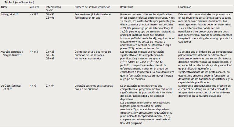 La psicoeducación aclara la opinión de las causas y efectos de la enfermedad o problema, ya que el conocimiento disminuye el riesgo de recaídas y de rehospitalizaciones. También, permite reducir el sentimiento de incapacidad y favorece la descarga emocional, física y social de angustia, temor, malestar, estigma y aislamiento, entre otros aspectos. De los estudios seleccionados se revisó el tamaño de muestra; este es variado desde 10 a 300 personas; con relación a la maniobra, la mayoría tienen grupo intervención y control; en cuanto al número de sesiones, es variado, de 3 a 24 con una moda de 14 sesiones2,7,9–13,15,18–23,25–27.